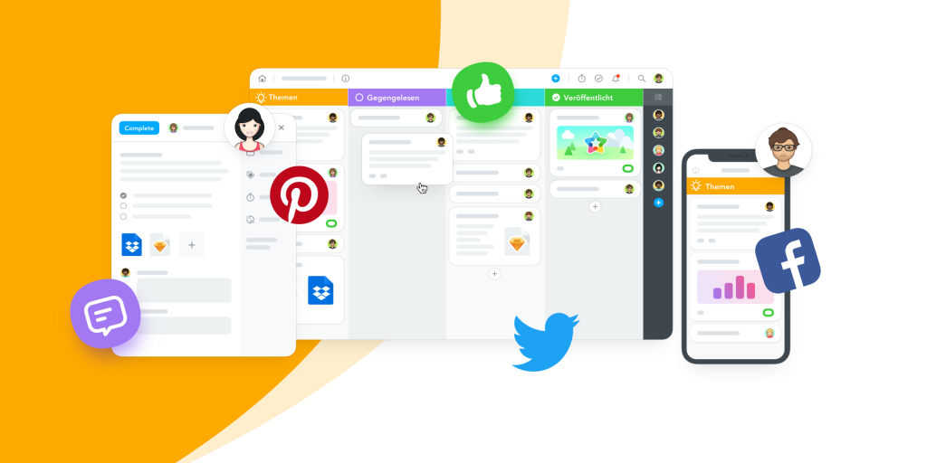 Auch themenbezogene Kanban-Boards sind natürlich denkbar. Wenn du jetzt beispielsweise regelmäßig Content für unterschiedliche Social Media Kanäle erstellst, könnte dieses Board wie folgt aussehen:
